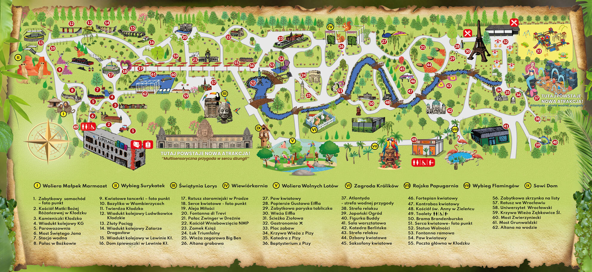 Pokrótce mówiąc, osoby planujące zwiedzanie Minieurolandu powinny przygotować się na wiele nowych doznań i ciekawych wrażeń, których nie sposób zaznać w żadnym innym miejscu. Pewnym jest, że pozytywnie Was zaskoczymy. Już na samym początku zwiedzania zobaczycie, jak mylne bywa pierwsze wrażenie. Patrząc na Minieuroland z parkingu mogłoby się wydawać, że przestrzeń parku jest niewielka, ponieważ widoczna jest tylko skromna część ogrodzenia. Tymczasem parkowe alejki z bujną roślinnością i misternie wykonanymi makietami, rozciągają się na ponad dwóch hektarach. Wszystko rozmieszczone jest na typowym dla Kotliny Kłodzkiej zróżnicowanym terenie. Nie musicie się martwić o komfort spaceru, bo ścieżki nie przypominają górskich szlaków i są wyłożone nowoczesną kostką brukową. Z resztą, przekonajcie się sami!